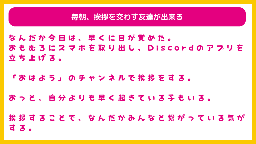 不登校の子どもたちのオンラインコミュニティにて、子どもたちのお兄ちゃん・お姉ちゃんとして、楽しく雑談をしていただきたいです。