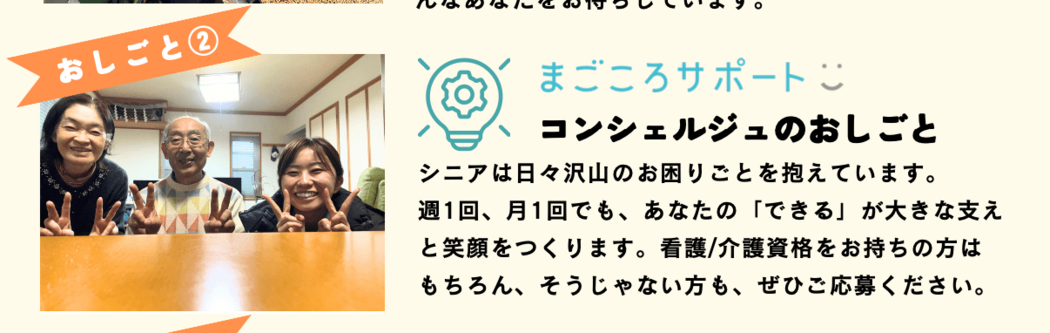 「まごころサポート」は、シニアの暮らしをお⼿伝いするサポートサービスです。シニアの皆さまからお困りごとをお聞きして、コンシェルジュと呼ばれる地域スタッフが直接サポートに伺います。「まごころサポート」だからこそ実現できる、⽣活に潜むほんの些細な"お困りごと"から、専⾨性の求められる"お困りごと"に合わせてプロフェッショナルをご紹介するなど、シニアお⼀⼈おひとりにあったサポートを提供いたします。