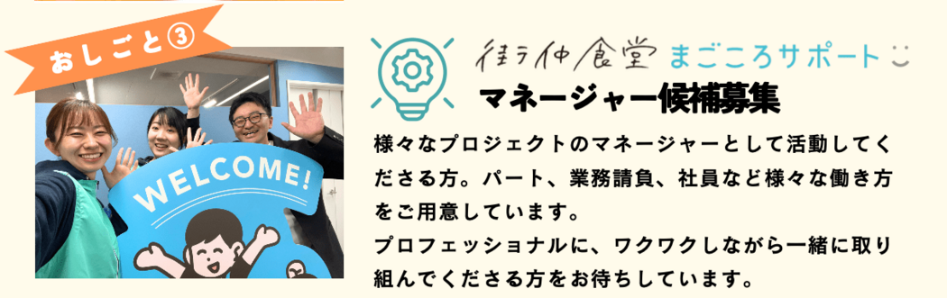 今回募集をしているのは街仲食堂、まごころサポートコンシェルジュ、マネージャー候補の3職種となります。