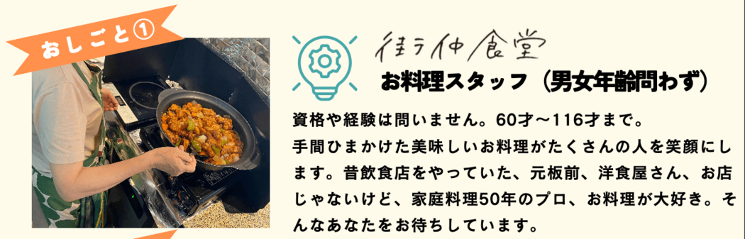 「プロのようにはできないけど、料理が好き」「ありがとう!と言われる仕事がしたい」「スキマ時間を活用して地域貢献がしたい」そんな皆様に向けた、複数のおしごとについてご紹介をするおしごと説明会を開催します