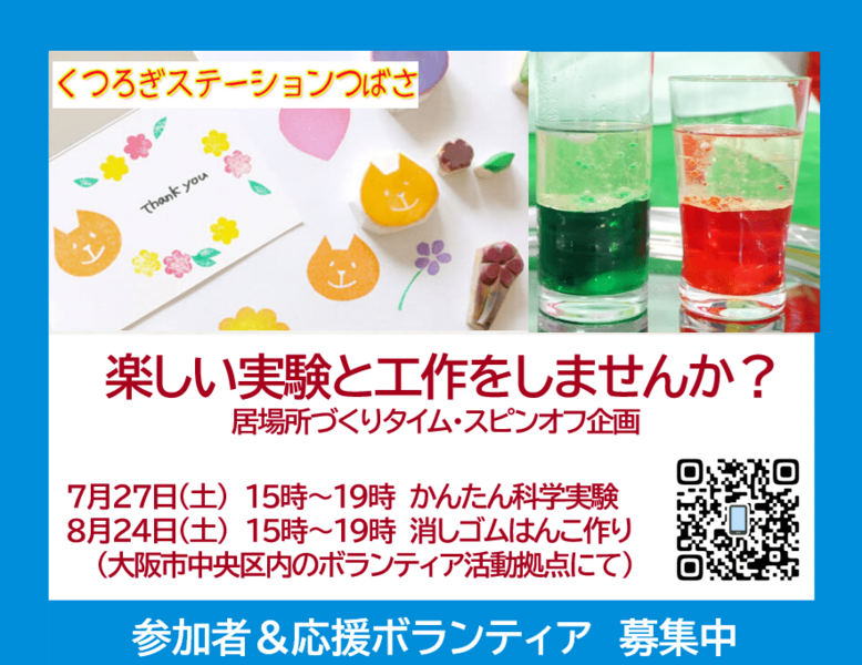 「消しゴムはんこ作り」「夏休みの工作」などが得意な人や共につくったりすることで生きづらさを抱える人を支えたい人を募集します。
