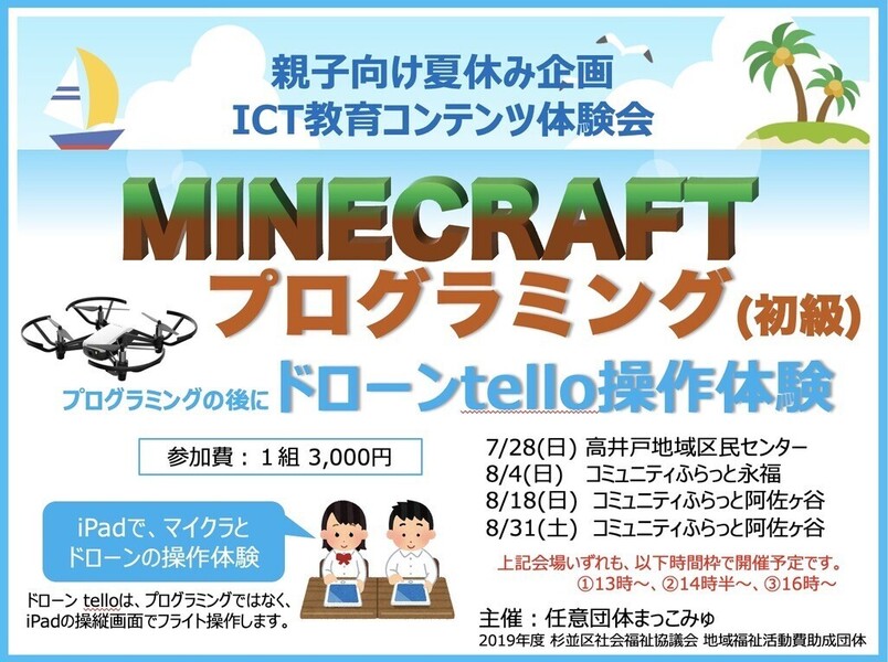 iPadを使ってマインクラフト・プログラミング(初心者・初級・中級)と、ドローンtelloの操作に関する親子向け実習講座を、杉並区内で定期的に開催予定でして、サポートいただける方を募集します。