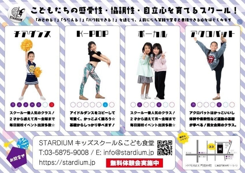 ”チアダンス・K-pop/J-popダンス・HIP-HOPダンス・体操・ボーカル”のキッズスクールを運営しているSTARDIUM(スターティアム)で、インストラクターや運営を目指している方!ぜひ!^^