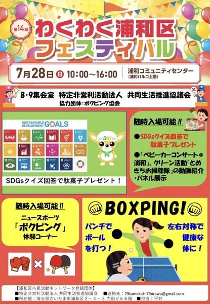 さいたま市浦和区と協働で、地域課題の解決を目指してまちづくりに取り組む「浦和区市民活動ネットワーク連絡会」による「第14回わくわく浦和区フェスティバル」に出展する、当法人のボランティアを募集します。