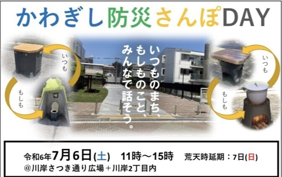 戸田市 川岸さつき通り広場+川岸2丁目で開催する「7/6(土)かわぎし防災さんぽDAY」で、「防災キャンプ」のイベントスタッフ募集です!(荒天時延期:7日(日)もご参加いただける方)