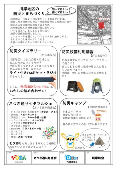 当法人が参加する「戸田防祭連合」として、「④川岸みんなの広場」で、防災キャンプを担当します。