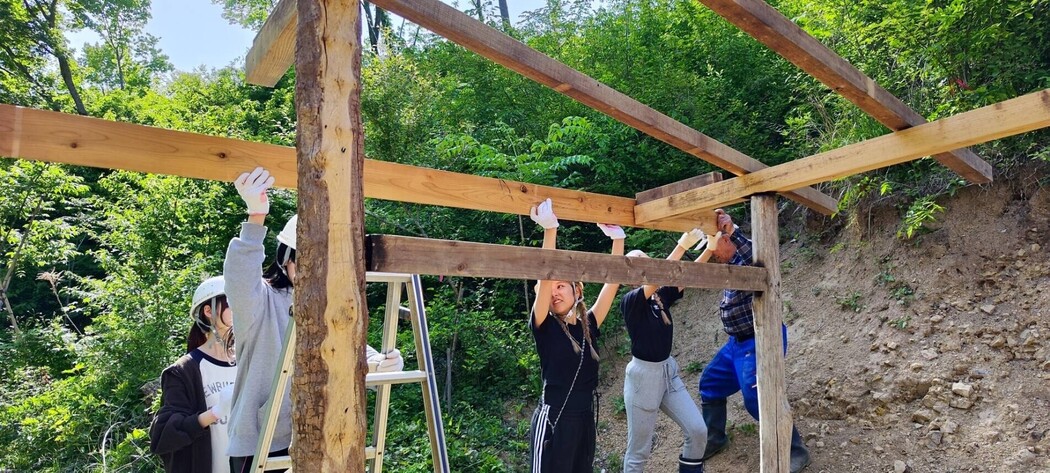●減災体験伝承プログラム用の炊事場にセルフビルド掘立小屋ボランティア500名と2年間かけて