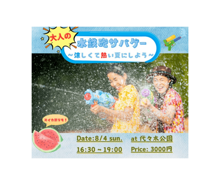夏っぽいことしたい! 水鉄砲したい!という方はもちろん、「最近運動してないけど身体動かしたいな」「新しい友達を見つけたい!」という方にもご満足いただけるコンテンツとなっておりますので、お気軽にご参加ください!
