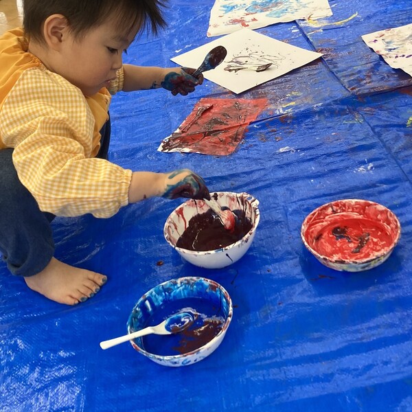 80平米の広ーい部屋で、筆を使わずに手や指に絵の具をつけておもいきり絵を楽しむ体験を子ども達に届けます。