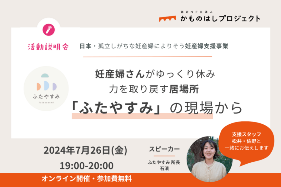 当日は、事業担当スタッフから「ふたやすみ」立ち上げの背景にある困難を抱えた妊産婦さんの問題や、事業の概要、現場で活動する中で感じていることをお伝えいたします。また質疑応答のお時間もお取りする予定です。