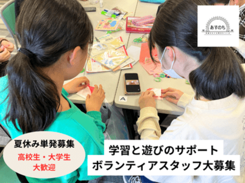 あすのちの特別企画「夏休みの宿題を終わらせよう」で、子どもの勉強や遊びをサポートするボランティアを大募集!高校生・大学生の参加大歓迎。7/21に事前説明会があるので安心してご参加いただけます。