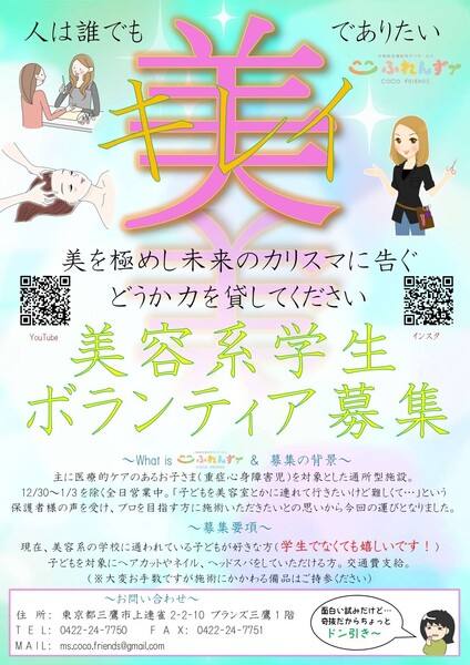 - お子さまを対象としたヘアカットやネイル等、美容系資格をお持ちのボランティア募集!