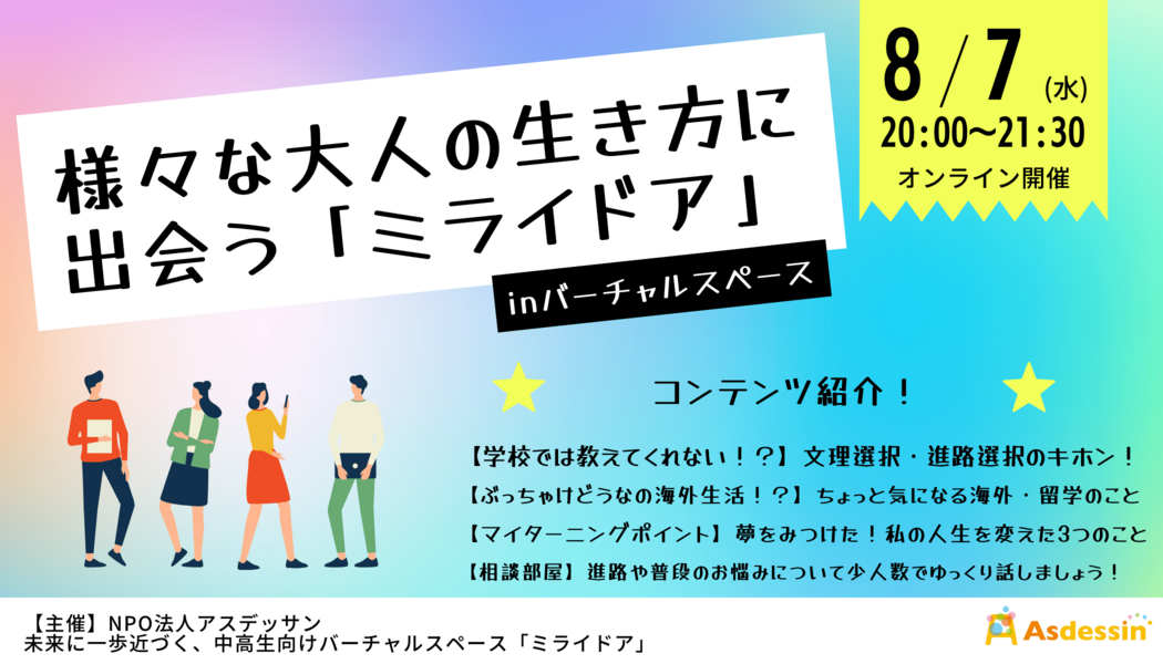 - 【中学生・高校生対象】様々な大人の生き方に出会う「ミライドア」オンライン開催