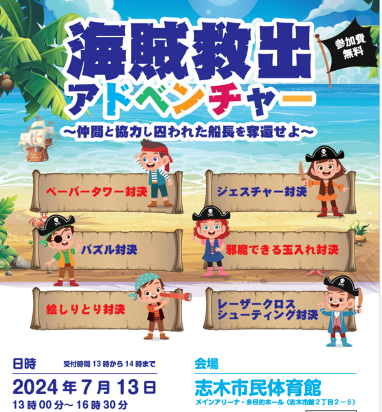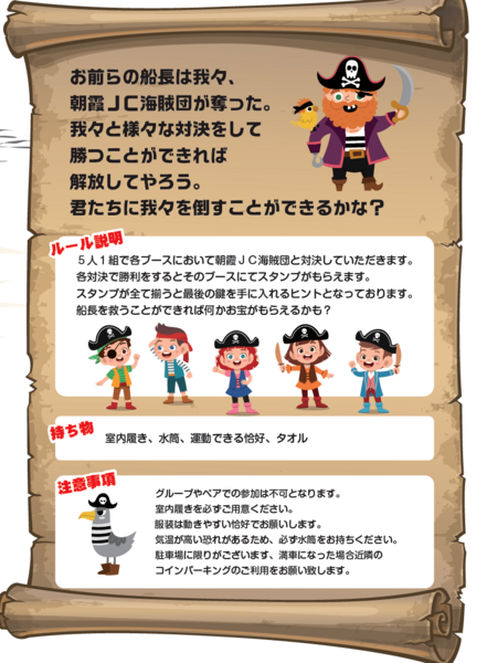 ・アイスブレイクファシリテーター(受付した子どもたちが5人1組になった時、全員初対面のため自己紹介を行いその手助けをしていただきます。また、各組で海賊旗を子どもたちで話し合いをして作るために円滑に進むように促していただきます。)
