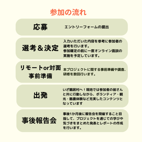 ボランティア内容としては、宿泊場所としてお世話になるハートンツリーさんの下で毎日の朝と夜の食事の準備と片付けのお手伝いと、ふるさと祭りの出店をボランティアスタッフとして行います。サスティナビリティを意識したレストランでのお手伝いになるので、とても学びと気づきの多いボランティア活動になると思います。