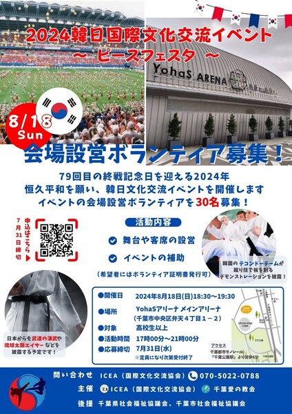 8/18㈰にYohaSアリーナ(千葉市中央区)で開催される韓日国際文化交流イベントの会場設営ボランティアを募集します。活動時間は17時~21時。ボランティア証明書発行可。韓国からテコンドーチームを招待