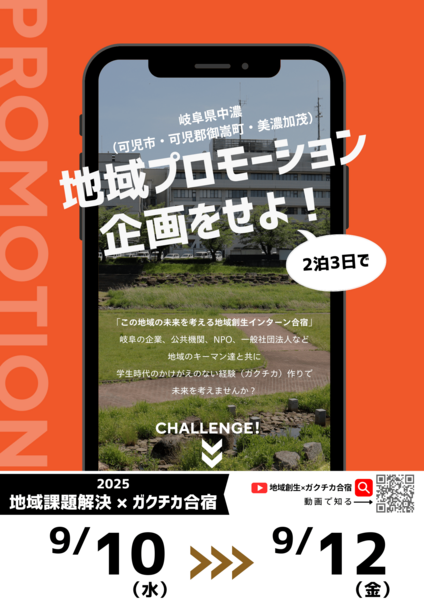 岐阜の中濃・東濃地域の街の企業・公共機関・NPO・一般社団法人と一緒にこの地域の未来を考える地域創生インターン合宿を開催します。学生時代のかけがえのない経験(ガクチカ)作りの企画になります。この地域のキーマン達と、一緒に未来を考えませんか?