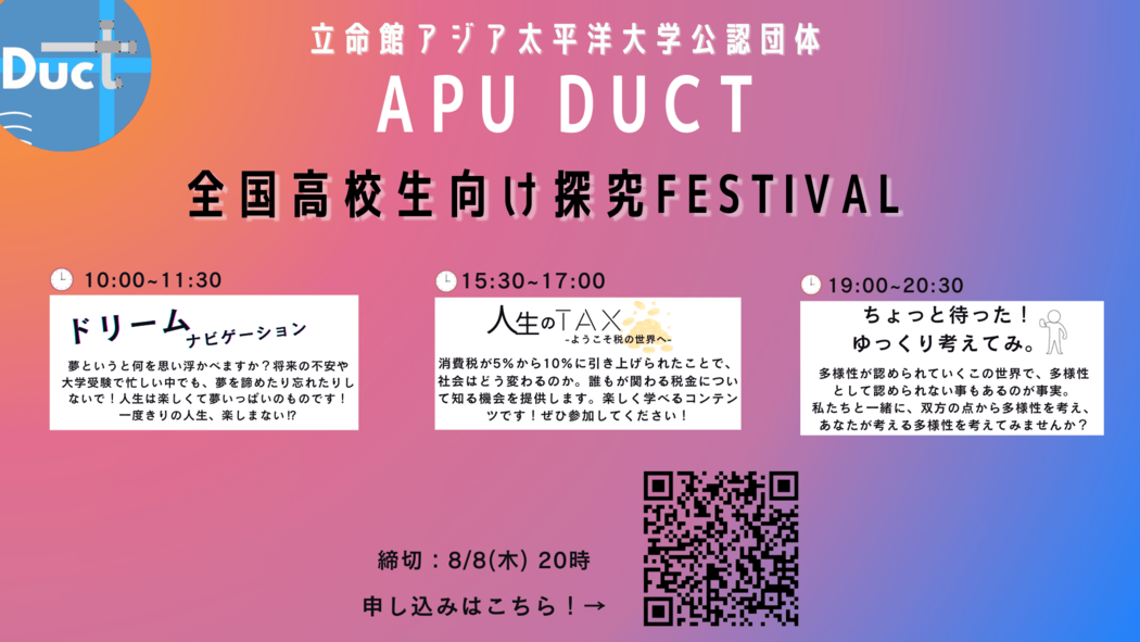 DUCTの活動を通して、高校生に社会問題についての関心を持ってもらう・知ってもらう。日本の高校では受動型の授業がほとんどで、実際に社会問題に触れる機会が少ないため、それをDUCTとの交流授業によって参加型授業を体験してもらい、より社会問題を身じかに感じてもらうことが目標です。私たちは、「教えるのではなく、共に考える」ということを理念とし、高校生を応援したいAPUの学生が学習のサポートを行います!
