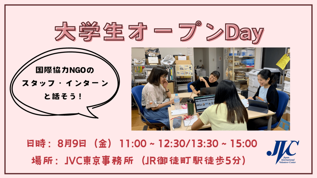 【JVCインターン生企画】大学・大学院生を対象にしたオープンデーイベントを開催します♪インターン生だけでなく、国際NGOで働くスタッフも交え、気になることを質問できます!希望者でランチ会も開催します。