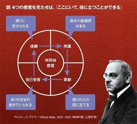 そしてアドラーの有名な心理学の理論に「共同体感覚」という考え方があります。かいつまんで言えば、和をもって尊しとなす日本の古きよき文化そのものです。協和、協調を重んじることこそが共同体の中で人が幸福に暮らしていくための鍵だとアドラーは述べています。