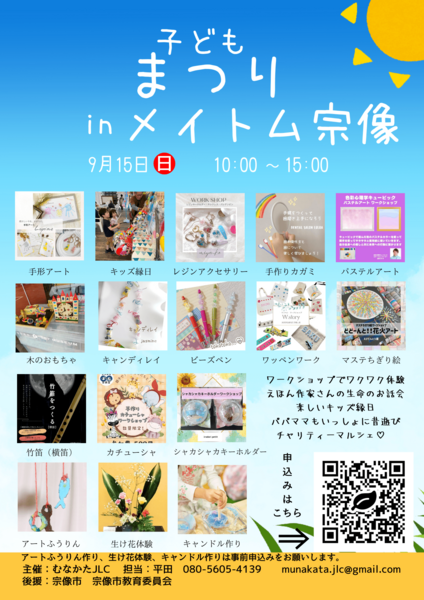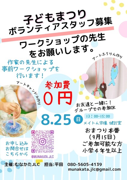 宗像市で9月15日に行われる【子どもまつり】内で行う子ども向けワークショップ(アートキャンドル作り・アートふうりん作り)の学生ボランティアさんを募集します♪