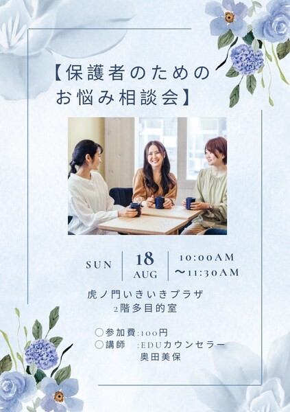 8/18(日)10時より 中高校生保護者のためのお悩み相談会(参加費100円)