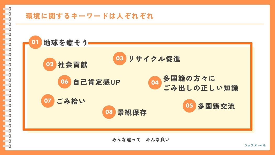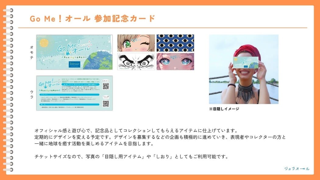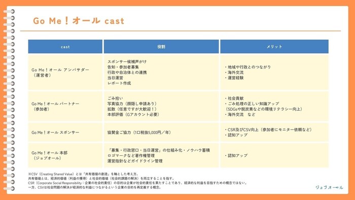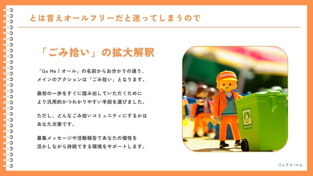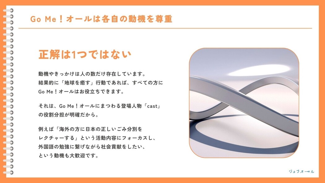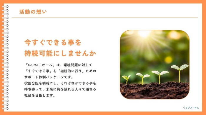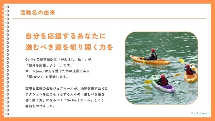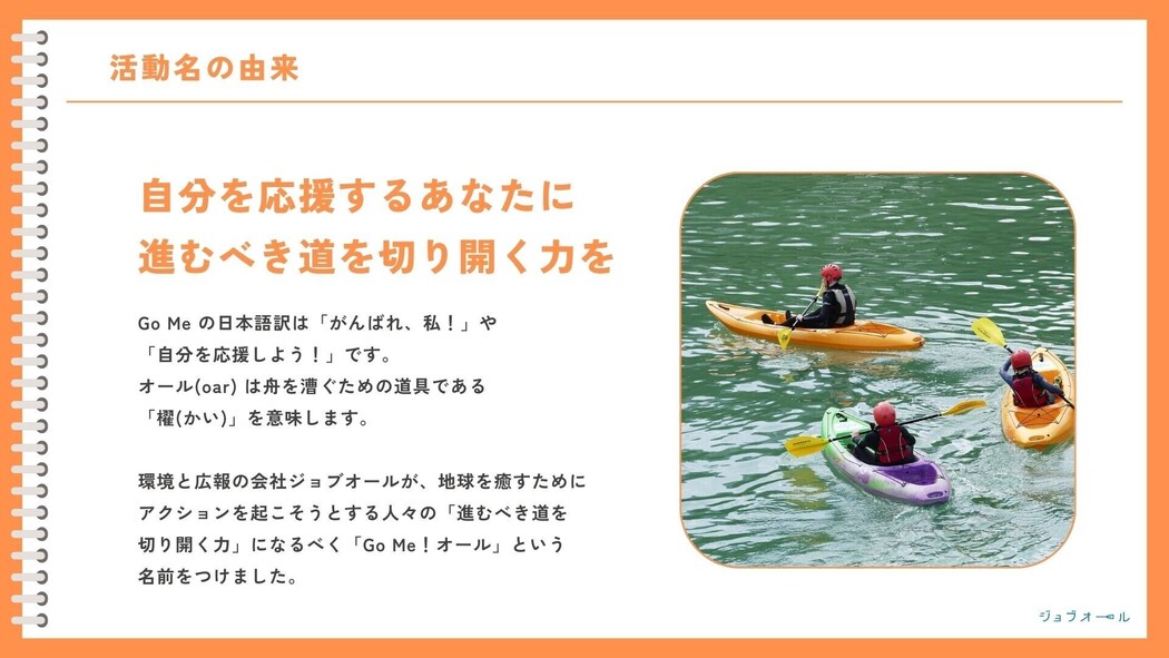 環境と広報の会社ジョブオールが、地球を癒すためにアクションを起こそうとする人々の「進むべき道を切り拓く力」になるべく「Go Me!オール」という名前をつけて本部運営をし、全国のアンバサダー(運営者)をサポートしています。
