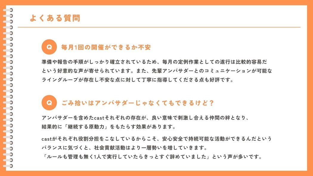 活動頻度:月1回 月一回ペースでごみ拾い活動を運営していただきます。 |