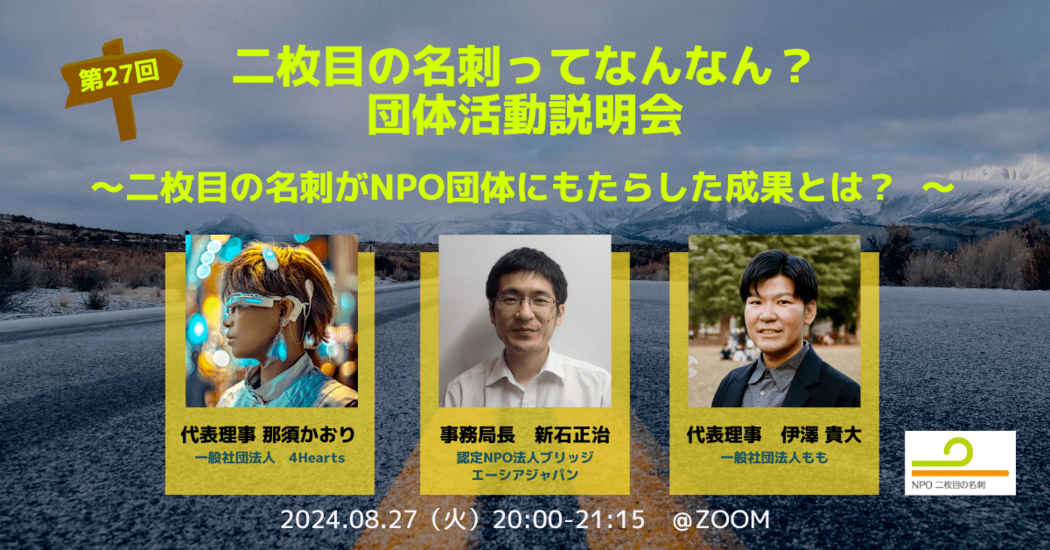 - プロボノ&NPO必見!中間支援団体「二枚目の名刺」活動説明会 8/27