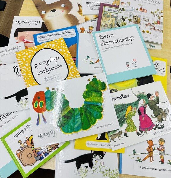 ミャンマー・カンボジア・タイなどアジアの学校や図書館、難民キャンプに絵本を届けるため、日本の絵本の文章部分に、現地語のシールを切って貼る作業を行います。まずは絵本を読み、楽しむところから始めます!
