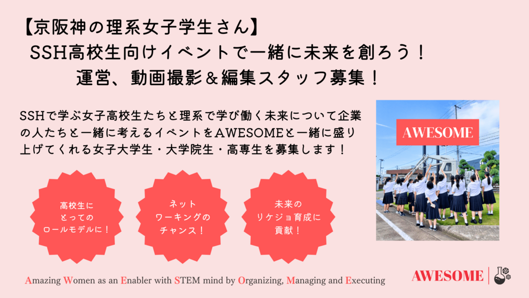 理系に進んだ⼥⼦高校生たちに理系出身女性たちの様々なロールモデルの姿を通して自分のこれからの進路を考えるためのイベントをAWESOMEと一緒に盛り上げてくれる女子大学生・大学院生・高専生を募集します!