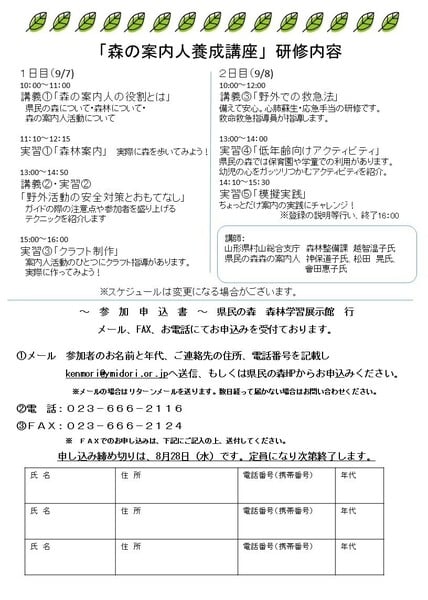 山形県県民の森のボランティア「森の案内人」を募集します。2024年9月7日、8日に開催する養成講座に参加いただいた上での登録となります。来場者や団体への森林案内やクラフト指導を行っていただきます。