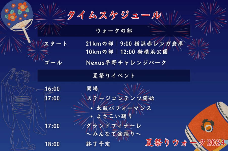 横浜赤レンガ倉庫からスタートする21kmの部、新横浜公園からスタートする11kmの部を用意しており、ゴールである夏祭り会場まで、横浜の名所を巡るルートを歩きます。ゴールは単なる夏祭りではなく、たどり着いた参加者を称える演出や、従来の夏祭りとは異なるフードやドリンク等を用意しており、朝から晩まで非日常を味わえる1日となるでしょう。