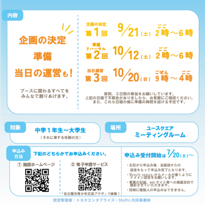 それに際して、「あそべるブース」を企画・運営する青少年を募集します😊企画の決定~準備、当日の運営まで、ブースに関わるすべてをみんなで創りあげます。