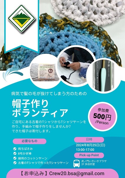 病気で髪の毛が抜けてしまう方のための帽子作りを行います。ご自宅にある古着からTシャツヤーンを作り、手で編みます。作った帽子は寄付します。ボランティア活動証明書を当日発行します。