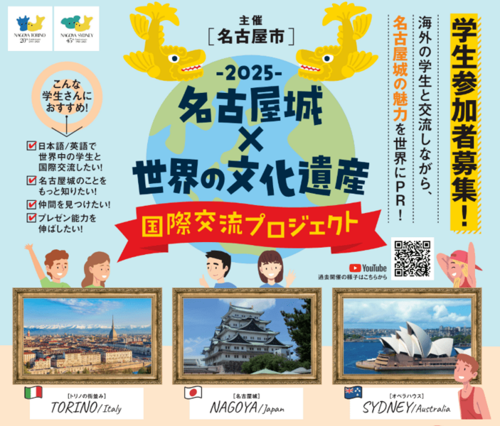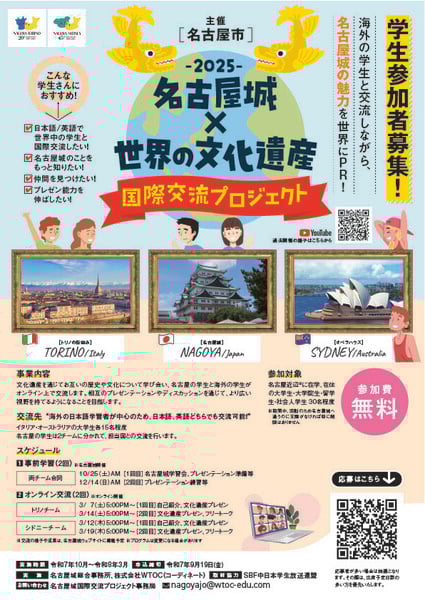 文化遺産の名古屋城を知り、海外へ発信するために、世界各国の学生たちと交流するプロジェクトです。2025年プログラムの企画、交流メンバーとして参加しませんか?交流言語は日本語、英語がメインです!