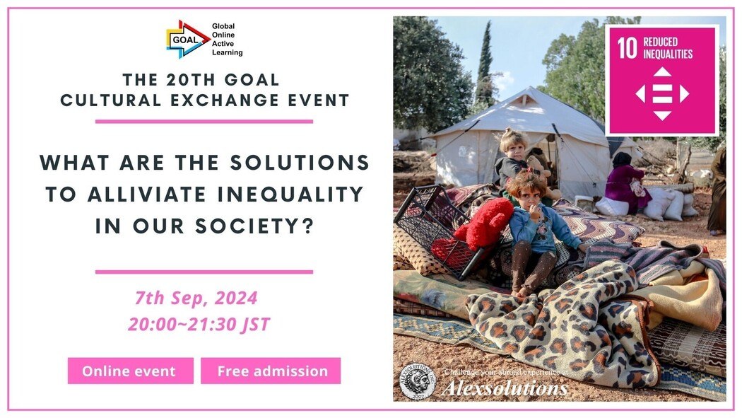 オンライン国際交流会で、「SDGs10:人や国の不平等をなくそう」について、国境を越えて英語でディスカッションしてみませんか?日本人研修生による英語のプレゼンもご覧になれます。