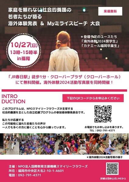 10/27に、児童養護施設等に暮らす/暮らした若者(ユース)による海外体験発表と夢を語るスピーチ大会のイベントを実施します!そのイベントを一緒に準備し、当日も盛り上げてくれるボランティアを募集します✨