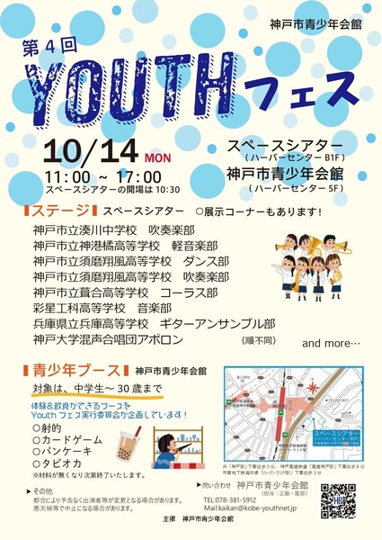 10月14日(月・祝)に、神戸市青少年会館の主催事業『Youthフェス』を開催します。大学生の実行委員が企画運営するゲーム・体験ブースや飲食ブースに、スタッフとしてサポートに入っていただきます。