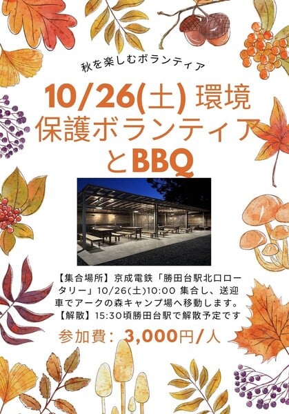 自然豊かなアークの森キャンプ場で秋を楽しむBBQ+中学生・高校生向けの環境保護のボランティアを行います。保護者の方も参加できますのでご家族で参加しませんか。ボランティア活動証明書を当日発行します。