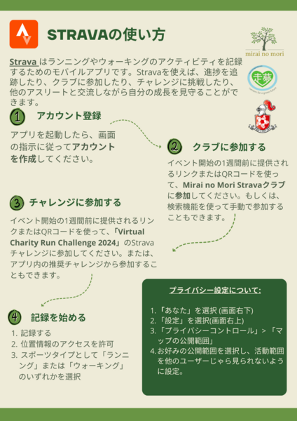 距離を記録し、日本全国や世界中の他の参加者と交流するために、「Mirai no Mori 2024 Virtual Run Challenge」にStravaで参加するよう招待されます。Stravaは、進捗を追跡し、同じ目標を持つランナーと共有するための無料オンラインプログラムです。