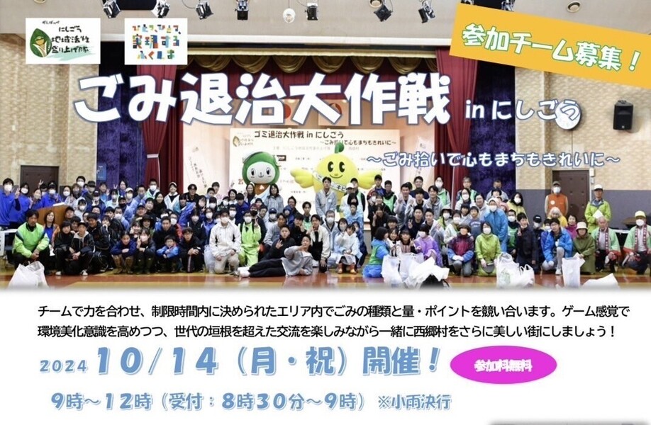 昨年度実施しました、ゲーム感覚でごみ拾いができるイベント「ごみ退治大作戦 in にしごう」を今年も10月14日(月・祝)に開催します!大会の詳細は下記の通りになります。