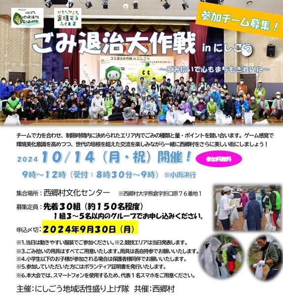 - 「ごみ退治大作戦inにしごう」参加者チーム募集!無料シャトルバスも出ます!