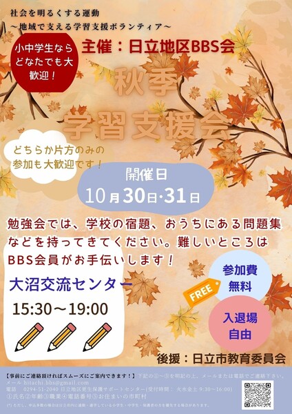 - 【日立市】10/30(水)31(木)大沼交流センターで学習支援を開催します
