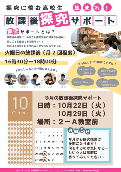 高校生の探究活動の相談や伴走支援ボランティアを募集します!石巻地域の高校で放課後の時間帯に実施。高校生一人ひとりに寄り添ったサポートを大切にしています。興味があれば探究授業に関わることもできます!