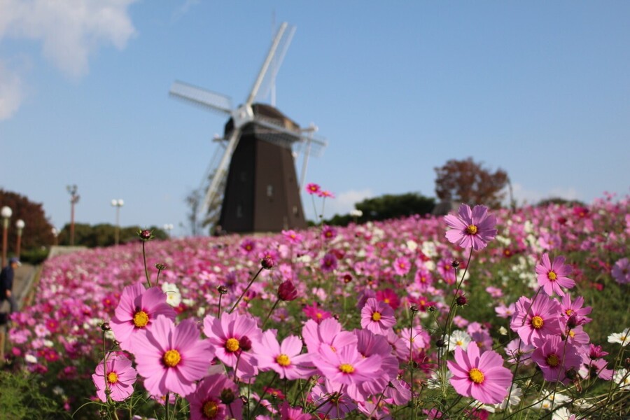 ちょうど鶴見緑地公園のコスモスが見頃なので楽しくボランティア活動しませんか✨風車とコスモスの写真を撮りましょう♪