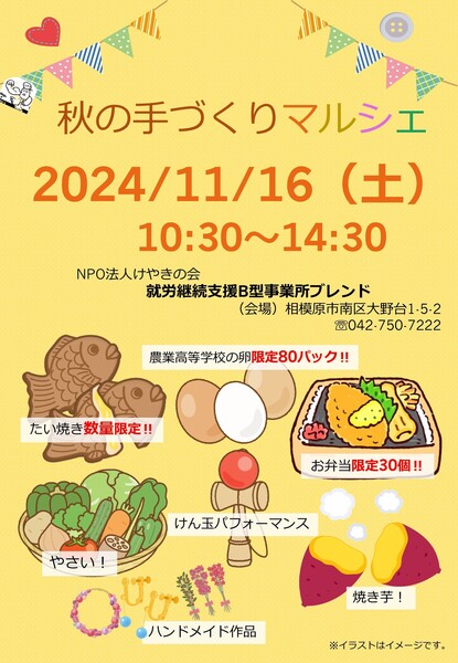 第5回「秋の手づくりマルシェ」を開催します!障害者施設や一般作家さんの手作り品、農業高校の卵、お菓子、お弁当などの販売します。地域の人が集うイベントを一緒に盛り上げて楽しい時間を作りましょう!