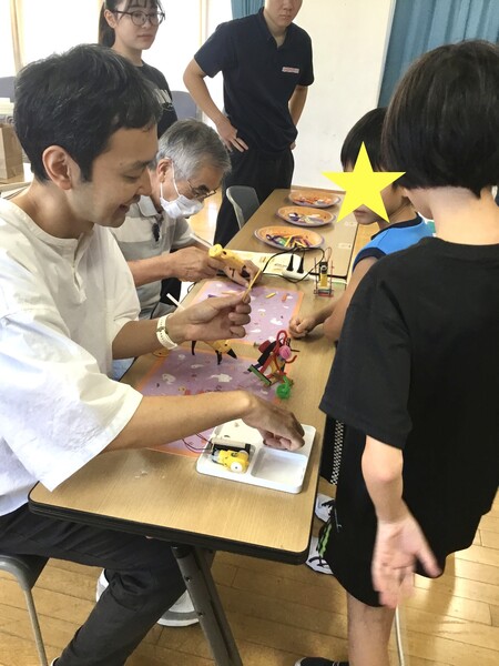 ②ギアモーターを使った簡単なロボット工作教室(1回につき4組・30分の教室を計2回実施)
