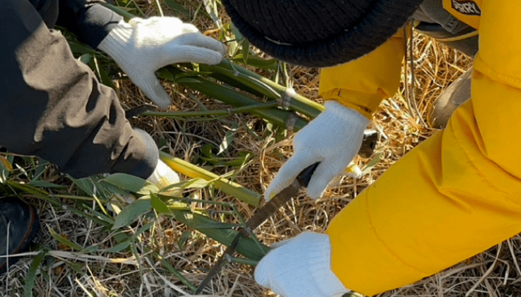 ◎STEP1:地域の方と一緒に竹林に入り、竹を切り倒していきます。