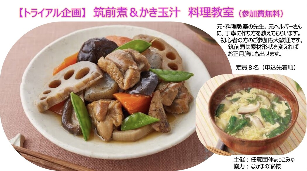 若者向けの高カロリーな料理作りではありませんが、今回は「筑前煮」と「かき玉汁」の調理を体験してみたい方や、地域交流のきっかけを探されている方など、多世代の方々の交流の場作りに賛同いただける方からのご応募をお待ちしております。